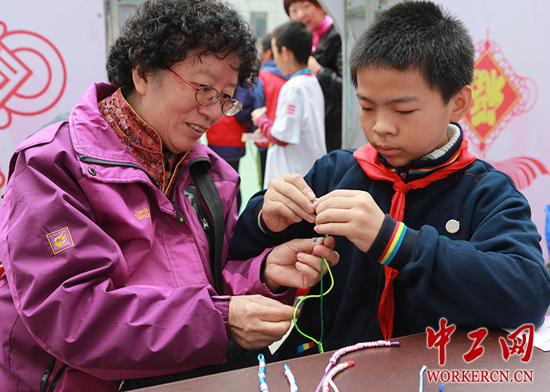 低年级的学生跟着老师学结绳。