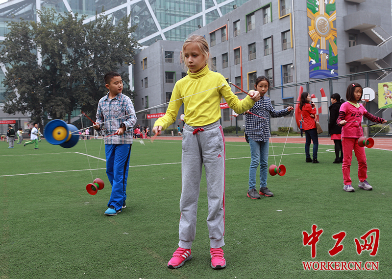 外国小朋友展示抖空竹的绝活。