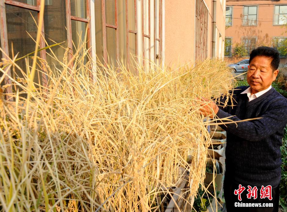10月22日,长春市民焦玉海在自家阳台上打理水稻。焦玉海介绍,他今年70岁,自退休后就在自家阳台研究用废旧箱子、塑料布等材料仿照土地坏境种植农作物,在2014年他已成功收获水稻10余斤。 中新社发 张瑶 摄