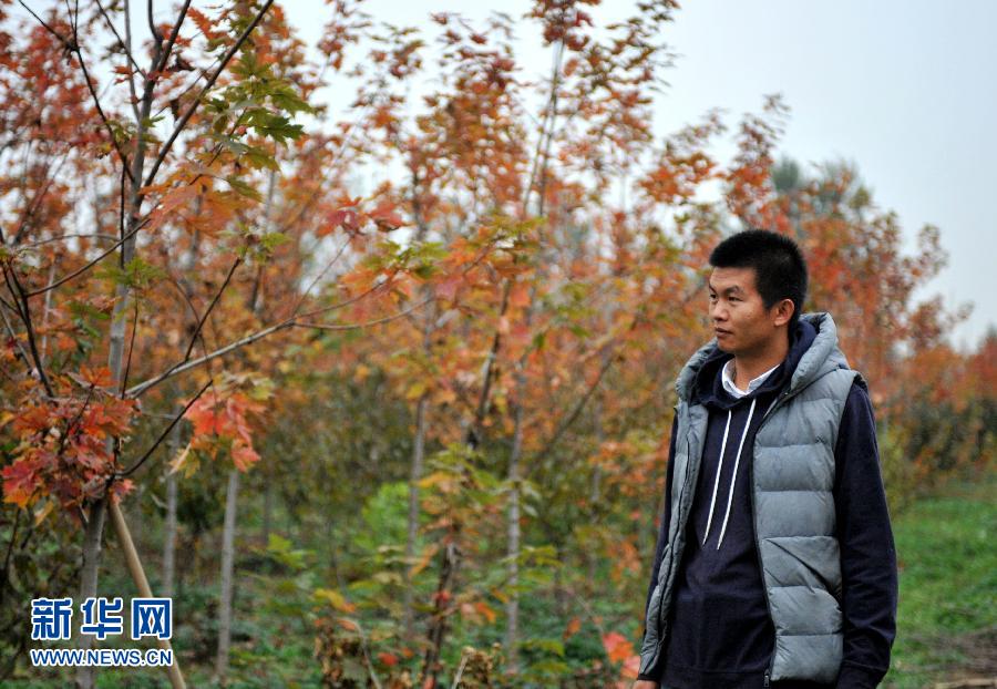 10月22日,王坤在自己的种植基地里查看树苗生长情况。从北京一家上市公司的小白领,到天津蓟县的“植树王”,“80后”小伙王坤在老家完成了职业转换,演绎出了一条另类的创业之路。王坤大学毕业一年后,辞掉北京的工作,回到老家蓟县包地种树。两年多时间里,他通过网络、书籍以及请教有经验的农民自学农业、林业知识,建成了彩叶树培育基地。创业之路充满艰辛,他遭遇过育苗的失败,也碰到过难以协调人情与效益冲突的棘手难题,还要时刻与偷树贼斗智斗勇。目前,他的培育基地里有美国红枫秋火焰、夕阳红、红叶白蜡等20多个品种,10万余棵成树,50万余棵种苗。这个村里老人眼里的另类大学生,通过自己的努力实现了自己的“树王梦”。新华社记者 张晨霖 摄
