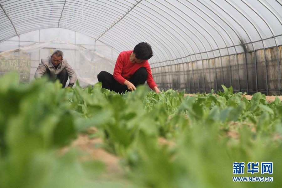 10月23日,山东滨州市博兴县庞家镇西高村农民正在管理大棚蔬菜。当日是“霜降”节气,山东滨州市博兴县农民加强农业防冻防寒措施,搞好田间管理和秋季农作物的抢收抢种工作。 新华社发(陈彬 摄)