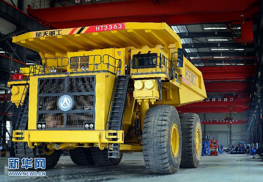 一台刚组装的HT3363型重型矿用自卸车驶出生产车间(10月23日摄)。由位于湖北省孝感市的航天重型工程有限公司设计研制生产的HT3363型重型矿用自卸车,车长15.77米,宽9.5米,高7.9米,自重237吨,额定载重达363吨,具有承载能力强、抗倾翻能力强、安全性能高、主要部件国产化等特点,被称为矿用自卸车中的“巨无霸”。新华社记者王颂摄