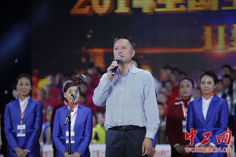 10月24日,由中国职工文化体育协会、中国社会工作协会、中国下一代教育基金会、中国老年保健协会主办的“2014全国全健排舞大赛”在浙江桐乡开幕。图为中国职工文体协会常务副秘书长、常务理事、中华全国总工会宣教部副巡视员崔志民宣布大赛开始。中工网记者韩靖摄