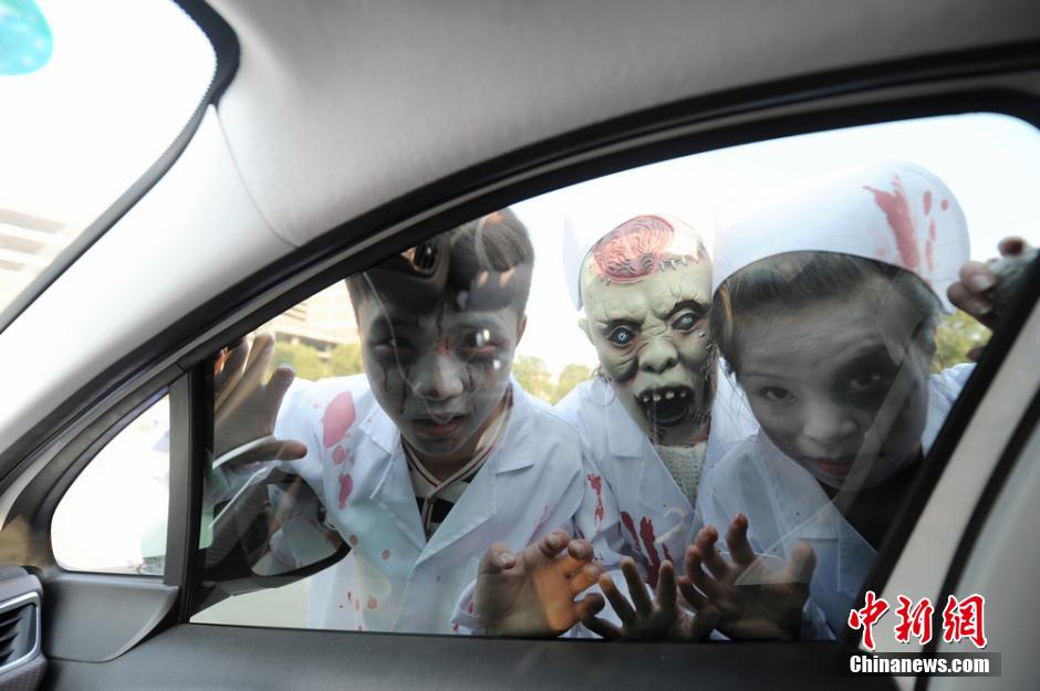 10月24日,参加长沙“怨灵病院主题鬼屋”招聘的应聘者走上街头扮“鬼”,吸引了众多市民围观。主办方表示,决定在万圣节前夕,日薪千元招聘“鬼王”,要求冷艳惊人或丑得独特。 杨华峰 摄