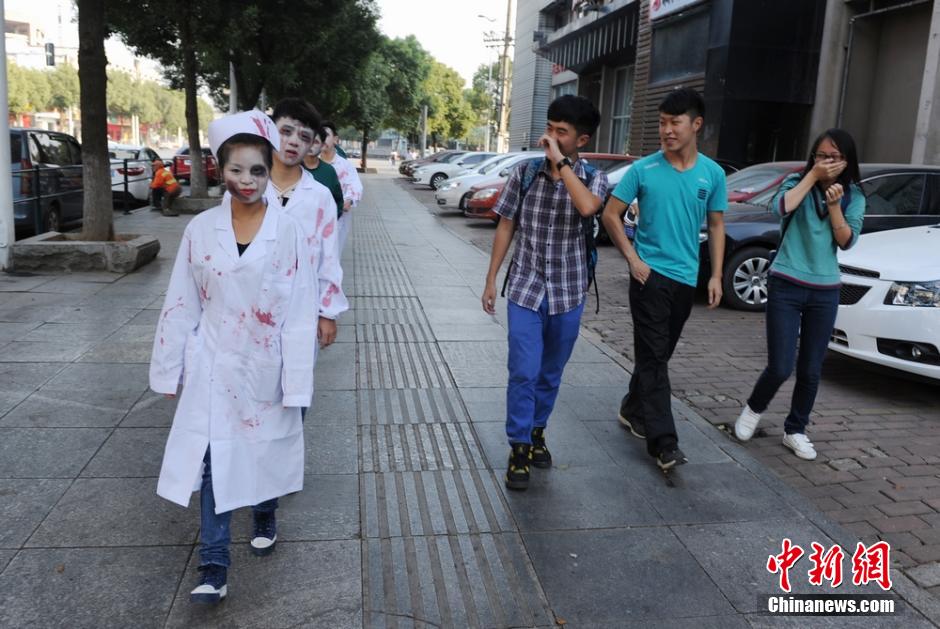 10月24日,参加长沙“怨灵病院主题鬼屋”招聘的应聘者走上街头扮“鬼”,吸引了众多市民围观。主办方表示,决定在万圣节前夕,日薪千元招聘“鬼王”,要求冷艳惊人或丑得独特。 杨华峰 摄