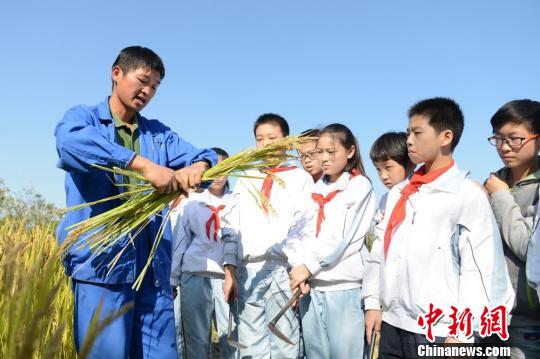 10月24日,苏州市东大街小学组织学生走进当地吴江同里北联村内的五月田农场,在农场工作人员的指导下,体验田间割稻劳动,感受“粒粒皆辛苦”的道理,学会珍惜粮食。