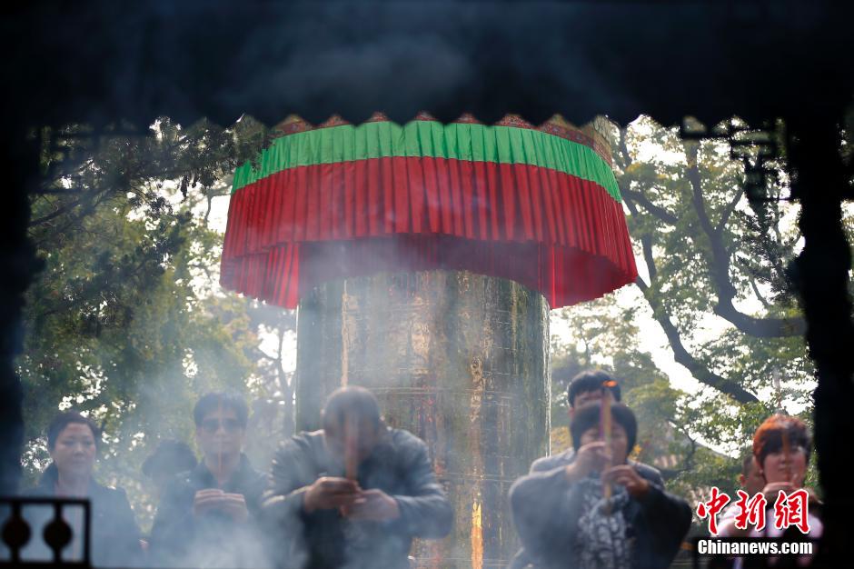 10月24日,民众在北京潭柘寺内转动巨型转经筒祈福。该转经筒于近日落成,高8米,重达22吨,其内部的经文遍数达到130亿遍,创下了世界之最。虽然转经筒这一事物来自藏传佛教,但潭柘寺内的师傅表示,在“显密共修”的趋势下,这并不妨碍转经筒在中原佛教的寺庙内出现。中新社发 富田 摄