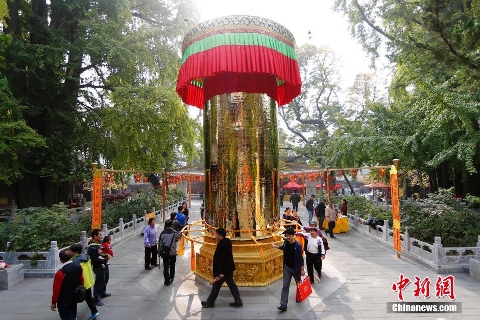 10月24日,民众在北京潭柘寺内转动巨型转经筒祈福。该转经筒于近日落成,高8米,重达22吨,其内部的经文遍数达到130亿遍,创下了世界之最。虽然转经筒这一事物来自藏传佛教,但潭柘寺内的师傅表示,在“显密共修”的趋势下,这并不妨碍转经筒在中原佛教的寺庙内出现。中新社发 富田 摄