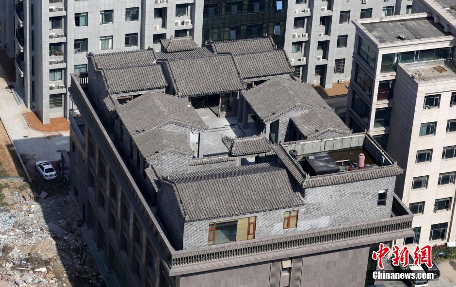 10月24日,河南荥阳,一座四层楼的楼顶盖起“仿古四合院”。这处建在荥阳农村信用联社院内四层小楼楼顶的仿古四合院式建筑,座南朝北,砖混结构,共9间房屋,两进院。前有大门楼,左右两边建有东、西厢房及配房,中间有个露天院落,面积500平方米左右,仿照中国传统的四合院建造。据了解,该建筑的建设单位是郑州海龙实业有限公司,建成后将用于该公司的红木家具展示中心。中新社发 杨正华 摄
