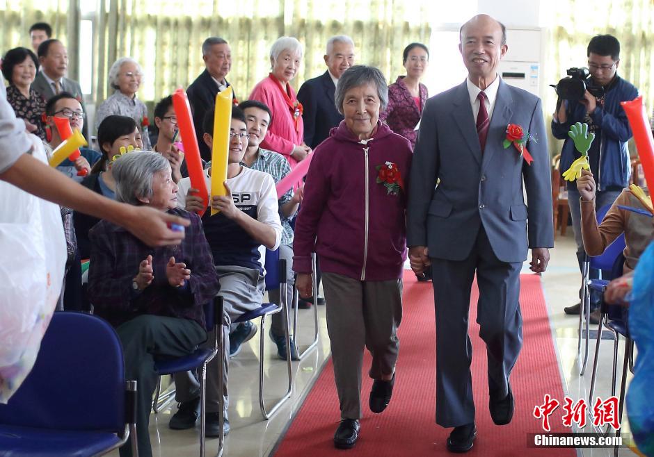 10月24日,一场金婚盛典在南京航空航天大学校园内举行,11对金婚夫妇在“婚礼进行曲”中走上红地毯,并与年轻大学生们分享了自己的爱情保鲜秘诀。据了解,南京航空航天大学从08年开始每年都为金婚的教职工组织一次隆重的金婚庆典,希望通过这样的活动让更多人来分享他们历经50年风雨历程、一路相伴的幸福与快乐。中新社发 泱波 摄
