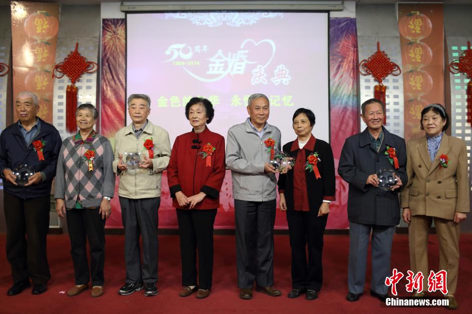 10月24日,一场金婚盛典在南京航空航天大学校园内举行,11对金婚夫妇在“婚礼进行曲”中走上红地毯,并与年轻大学生们分享了自己的爱情保鲜秘诀。据了解,南京航空航天大学从08年开始每年都为金婚的教职工组织一次隆重的金婚庆典,希望通过这样的活动让更多人来分享他们历经50年风雨历程、一路相伴的幸福与快乐。中新社发 泱波 摄