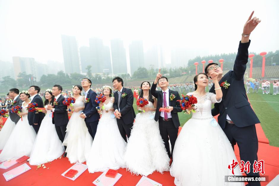 图为新人们放飞气球期待幸福。 钟建 摄