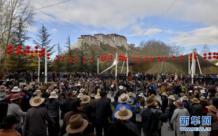 10月27日,拉萨市民在布达拉宫脚下的宗角禄康公园内跳起欢快的“锅庄”舞。每天早晨,拉萨市宗角禄康公园都会汇集众多前来晨练的拉萨市民,他们跳起欢快的“锅庄”、唱起优美的牧歌,为清晨的拉萨添加一道独特的风景。新华社记者普布扎西摄