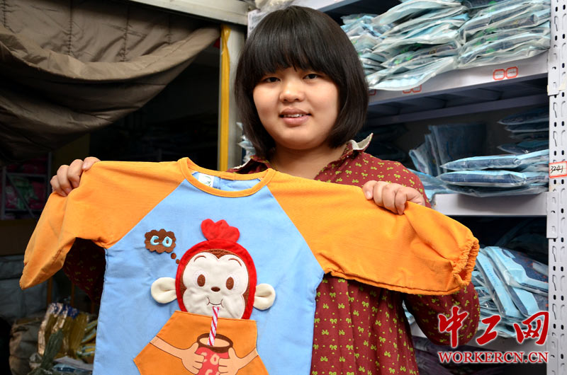 孙峥峥展示自己的货品,专营品牌童装。 (中工网记者 笑语摄)