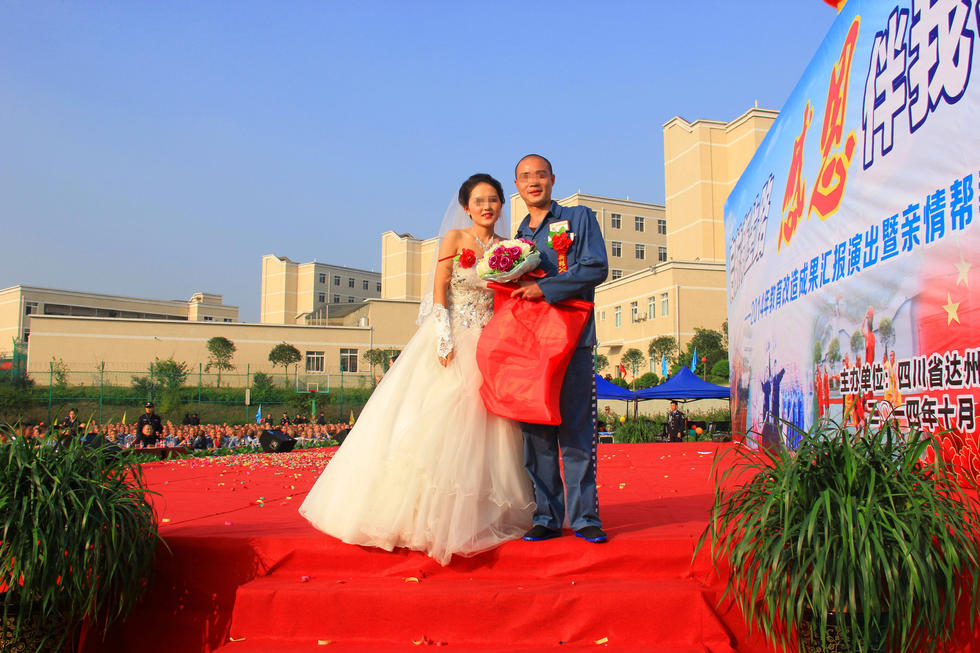 10月23日下午,在四川达州监狱的操场上,曾经的毒贩王智(化名)在监狱工作人员及狱友的精心安排下,迎来了身着白色婚纱长裙的女孩青青(化名)。