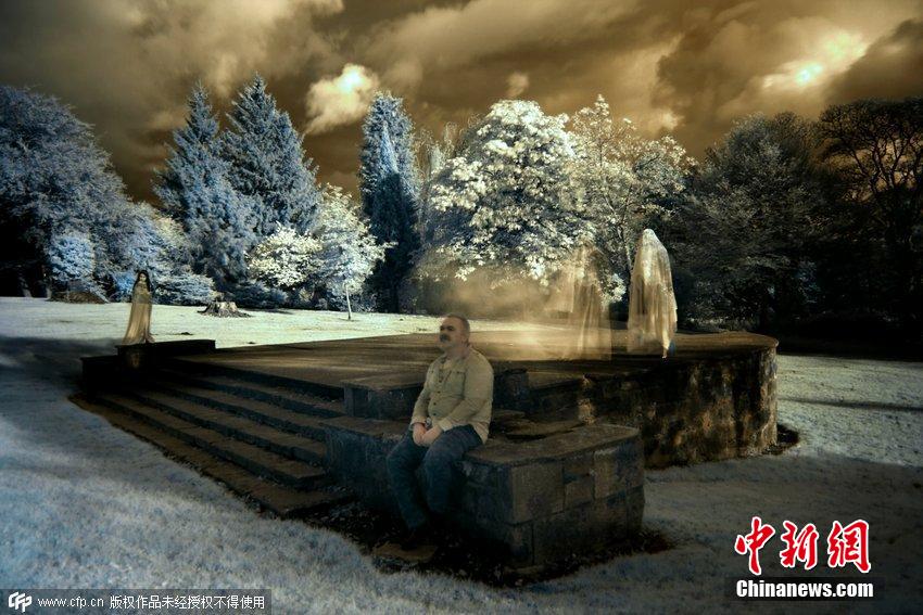 2014年10月30日消息(具体拍摄时间不详),英国基尔赛斯,红外线照相机捕捉到Colzium庄园漂浮游荡的“鬼影”。这些“鬼影”聚集在一块纪念碑附近,体形清晰但五官模糊。图片来源:CFP视觉中国