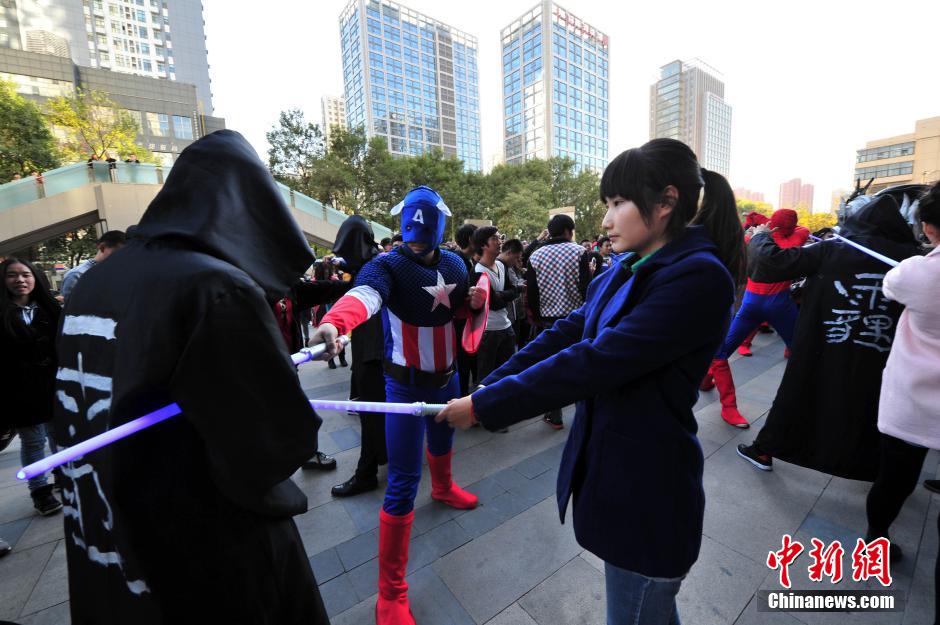 11月2日下午,由“异形、铁血战士、威震天”率领的雾霾军团,侵袭石家庄市中心街头,“美国队长、钢铁侠、蜘蛛侠、蝙蝠侠”等美国大片中的复仇者联盟超级英雄们现身大战雾霾军团,有些市民自发加入到战斗中,帮助英雄攻对抗雾霾。据了解,这是一个由30多名“90后”大学生组成,利用课余时间义务表演的抵抗雾霾行为艺术,旨在唤醒民众环保意识,一起抵抗、治理雾霾。图为“美国队长”与女市民一同对抗雾霾黑衣人。中新社发 翟羽佳 摄