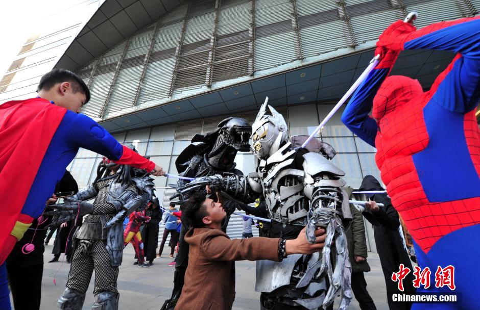 11月2日下午,由“异形、铁血战士、威震天”率领的雾霾军团,侵袭石家庄市中心街头,“美国队长、钢铁侠、蜘蛛侠、蝙蝠侠”等美国大片中的复仇者联盟超级英雄们现身大战雾霾军团,有些市民自发加入到战斗中,帮助英雄攻对抗雾霾。据了解,这是一个由30多名“90后”大学生组成,利用课余时间义务表演的抵抗雾霾行为艺术,旨在唤醒民众环保意识,一起抵抗、治理雾霾。图为“超人与蜘蛛侠”拯救民众。中新社发 翟羽佳 摄
