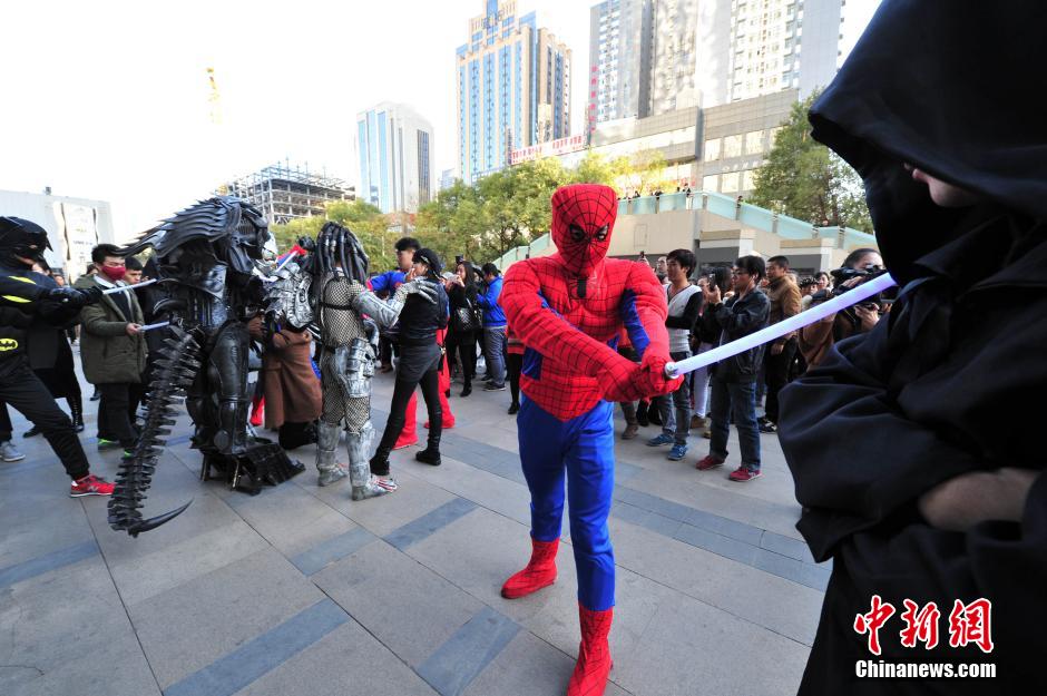 11月2日下午,由“异形、铁血战士、威震天”率领的雾霾军团,侵袭石家庄市中心街头,“美国队长、钢铁侠、蜘蛛侠、蝙蝠侠”等美国大片中的复仇者联盟超级英雄们现身大战雾霾军团,有些市民自发加入到战斗中,帮助英雄攻对抗雾霾。据了解,这是一个由30多名“90后”大学生组成,利用课余时间义务表演的抵抗雾霾行为艺术,旨在唤醒民众环保意识,一起抵抗、治理雾霾。图为蜘蛛侠“单挑”雾霾黑衣人。中新社发 翟羽佳 摄