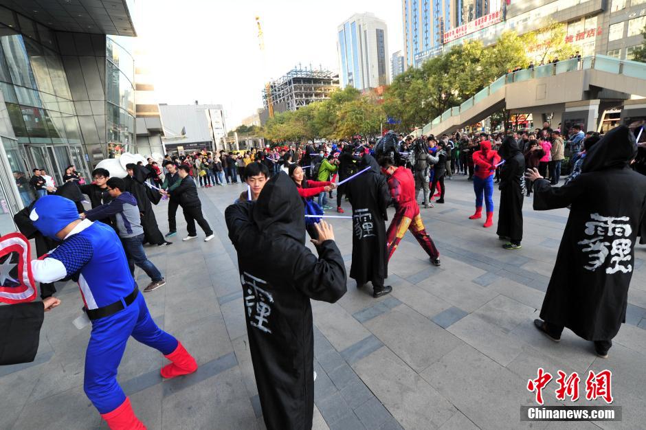 11月2日下午,由“异形、铁血战士、威震天”率领的雾霾军团,侵袭石家庄市中心街头,“美国队长、钢铁侠、蜘蛛侠、蝙蝠侠”等美国大片中的复仇者联盟超级英雄们现身大战雾霾军团,有些市民自发加入到战斗中,帮助英雄攻对抗雾霾。据了解,这是一个由30多名“90后”大学生组成,利用课余时间义务表演的抵抗雾霾行为艺术,旨在唤醒民众环保意识,一起抵抗、治理雾霾。图为超级英雄现身大战雾霾军团。中新社发 翟羽佳 摄