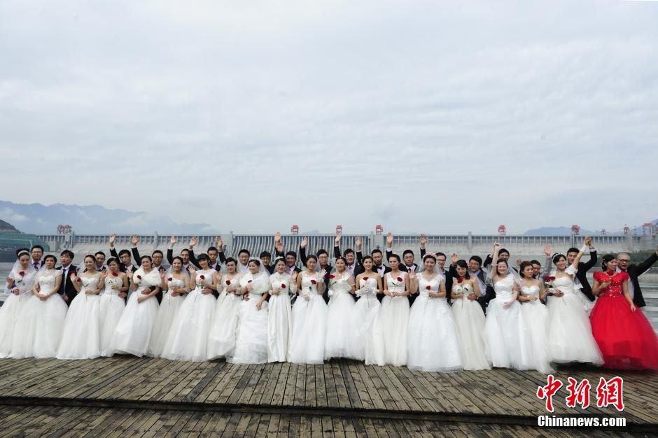 11月2日,2014三峡大坝大型集体婚礼在三峡坝区截流纪念园温暖上演。当天上午,百对新人身着盛装,缓缓步入婚礼仪式主会场。仪式开始后,每位新郎手持玫瑰,紧紧牵着身边的新娘,或拍照,或耳语,或互相整理衣装,或默默目视前方。随后,新郎们面朝大坝现场求婚,并在三峡大坝的见证下,与新娘们彼此许下今生相守的庄重诺言。最后,在现场数千名市民的欢呼声中,新郎们同时把自己的新娘抱起,婚礼仪式正式礼成。王康明 摄