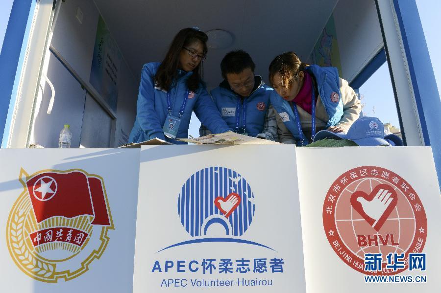 11月2日,志愿者在北京市怀柔区街头的志愿者服务亭工作。 APEC会议日益临近,会议举办地北京市的志愿者已经进入工作状态。2014年亚太经合组织(APEC)领导人会议周活动将于11月5日至11日在北京举行。新华社记者 马宁 摄 图片来源:新华网