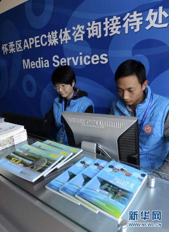 11月2日,志愿者在北京市怀柔区APEC媒体咨询接待处工作。 APEC会议日益临近,会议举办地北京市的志愿者已经进入工作状态。2014年亚太经合组织(APEC)领导人会议周活动将于11月5日至11日在北京举行。新华社记者 马宁 摄 图片来源:新华网