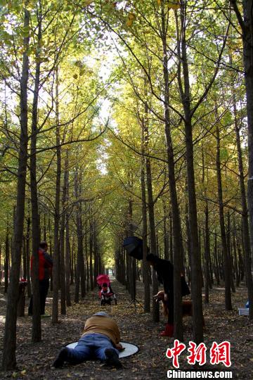 图为西安民众在汉阳陵银杏林游览、拍照。 田进 摄