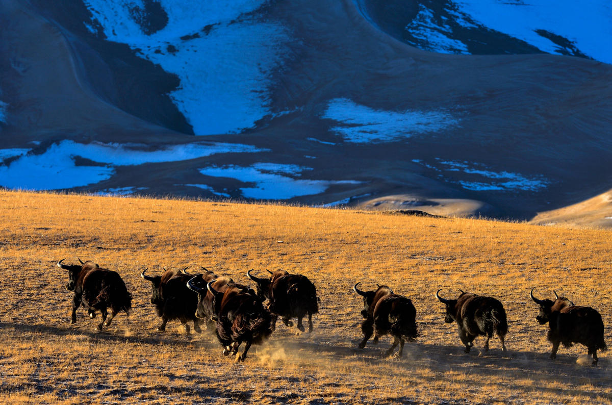 在阿尔金山国家级自然保护区奔跑的野牦牛(10月24日摄)。新华社记者 储学军 摄