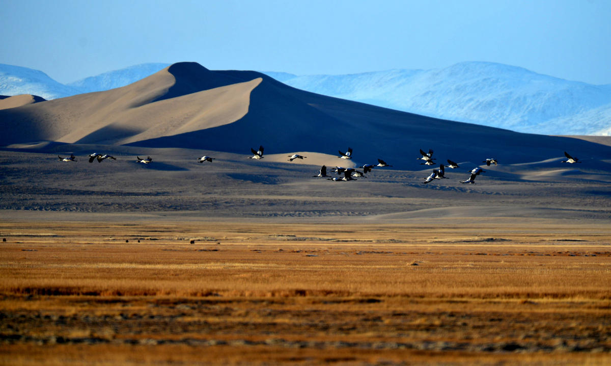 一群黑颈鹤飞翔在阿尔金山国家级自然保护区里的雪山大漠间(10月24日摄)。新华社记者 储学军 摄