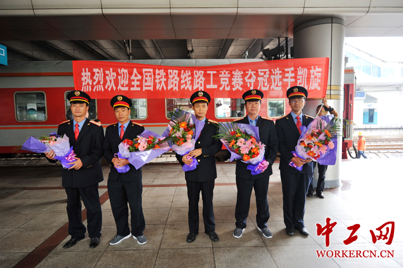 11月5日11时40分,武汉到南昌的D3221次进站,刚刚参加完在武汉举办的第四届全国铁道行业职业技能大赛,工务系统线路工决赛的选手们载誉归来。南昌铁路局党委书记王秋荣,路局工会主席卢文星,路局总工程师詹志文,工务处、劳卫处、职教处等部门负责人到车站迎接。此次竞赛,南昌铁路局共夺取五项第一,分别是团体第一名,个人全能第一名,道岔单项团体第一名,道岔检查分析个人第一名,轨检车检查分析个人第一名;另外囊括个人全能第四、第十四名,创历史最好成绩。