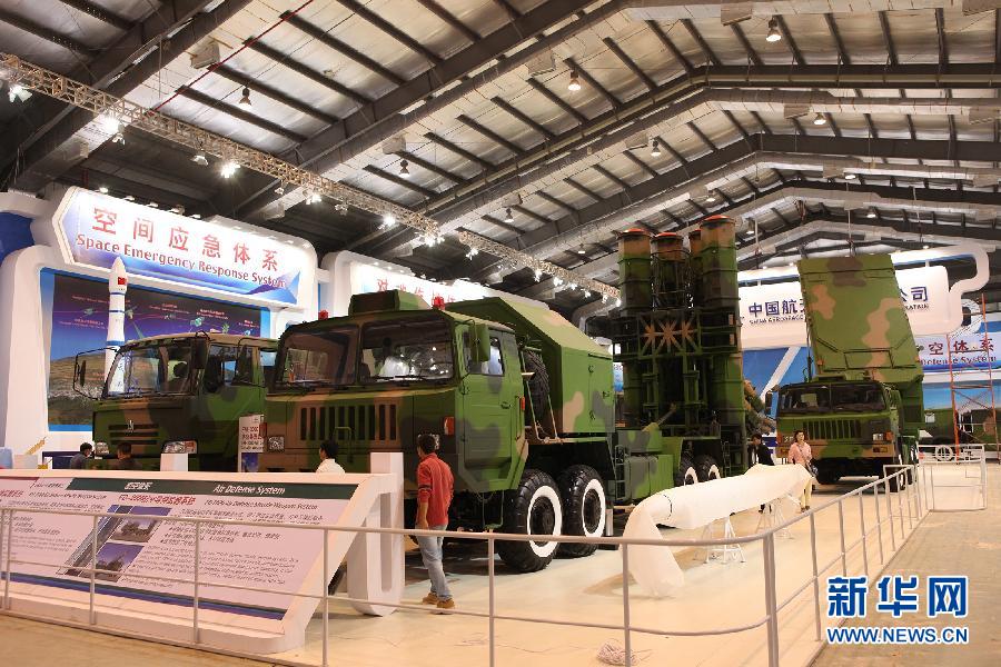 中国航天科工集团防空导弹武器系统在进行布展(11月8日摄)。第十届中国国际航空航天博览会将于11月11日至16日在广东省珠海市举行。本届展会规模空前,参展飞机数量超130架,国内外参展商近700家,中国一批先进的军民用航空器及航天精品、新型装备将在航展中集体亮相。新华社发(庞杰 摄)