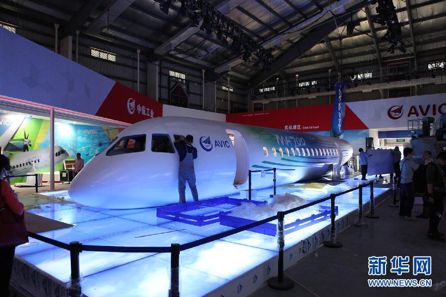 中航工业新舟700飞机模型正在布展(11月8日摄)。第十届中国国际航空航天博览会将于11月11日至16日在广东省珠海市举行。本届展会规模空前,参展飞机数量超130架,国内外参展商近700家,中国一批先进的军民用航空器及航天精品、新型装备将在航展中集体亮相。新华社发(庞杰 摄)