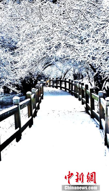 初冬的大雪让四川达古冰山景区瞬间变成银色的世界,树梢挂满了毛茸茸﹑亮晶晶的银条儿;冬夏常青的松树和柏树,堆满了蓬松松﹑沉甸甸的雪球。一阵风吹来,树枝轻轻地晃动,银条和雪球簌簌地落下来,玉屑般似的雪末儿随风飘扬,映着清晨的阳光,显着出一道道五光十色的彩虹,松软的雪花压在树枝和秋叶之上别有一番景致,美不胜收。黄仕海 摄