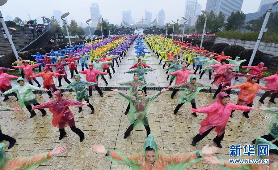 11月8日,人们在冒雨参加“万人同跳一支舞”活动。当日,“万人同跳一支舞”活动在浙江举行。25703位市民分布于19个会场,在《舞动中国》舞曲伴奏下冒雨同跳一支舞,创造“最多人数同跳排舞”的新吉尼斯世界纪录,打破了2007年由美国亚特兰大创造的17200人记录。新华社发(李忠 摄)
