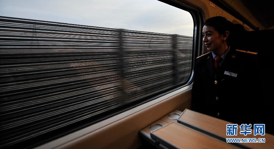 列车员在关注车窗外的防风墙——这是目前国内唯一在沿线设有防风墙的高铁线路(11月8日摄)。由中国北车长客股份公司研制的CRH5型动车组,将于16日在兰新铁路第二双线(乌鲁木齐至哈密段)正式运行,由于沿途的地理特点鲜明,使这条新开通的线路被称为中国高铁的“新疆之旅”。当日,铁路管理部门组织了试乘活动,使记者有机会提前揭开其神秘面纱。据介绍,将载着乘客完成“新疆之旅”的CRH5型动车组,最高设计时速为250公里。由于兰新铁路沿线地区属温带大陆型气候,所以车体和沿线设施有针对性地进行了防沙、防风、防雪、保温等要素的设计。乘客上午9时在乌鲁木齐南站出发,中午12点28即可抵达哈密,沿途经过吐鲁番、鄯善、吐哈等站,且能领略到沿途特有的西域风景。新华社记者 王昊飞 摄