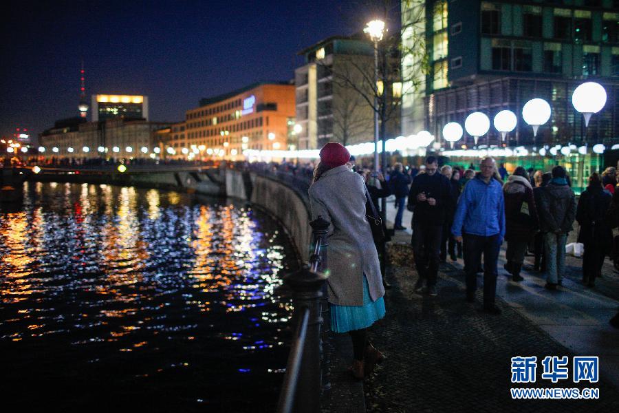 11月8日,在德国柏林,游客参观“灯光边界”。 11月7日至9日,德国首都柏林沿着柏林墙原址走向设置了一条“灯光边界”,以纪念柏林墙倒塌25周年。这件灯光装置作品全长约15公里,由8000个发光的白气球组成。新华社记者张帆摄
