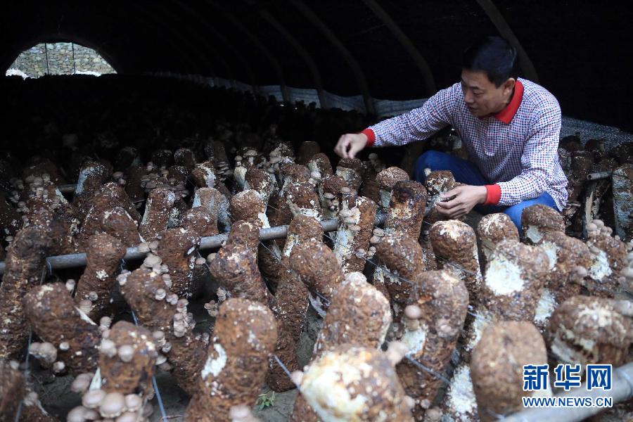 11月8日,工作人员在湖北十堰郊区一处蘑菇种植大棚中管理生长的蘑菇。近年来,湖北十堰地方政府对当地蘑菇产业基地加大投资,引进技术,扩大种植,就地加工,形成食用菌规模化生产,有效带动当地贫困农民增收脱贫。新华社发(张燕辉摄)