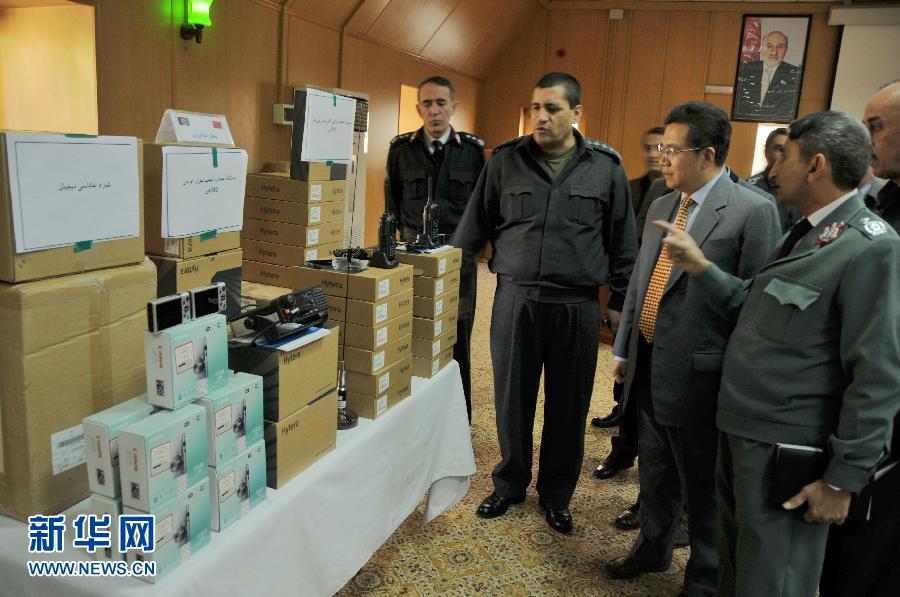 11月8日,在阿富汗首都喀布尔,中国驻阿富汗大使邓锡军(右二)和阿富汗内政部第一副部长萨朗吉(左二)查看警用设备当日,中国援助阿富汗的一批警用设备正式移交阿方。中国驻阿富汗大使邓锡军、阿富汗内政部第一副部长萨朗吉出席移交仪式。中方此次移交的物资包括通讯设备、取证相机、警用头盔和盾牌、药(毒)品快速检测设备等,中方还向阿方提供设备操作培训等帮助。新华社记者陈杉摄