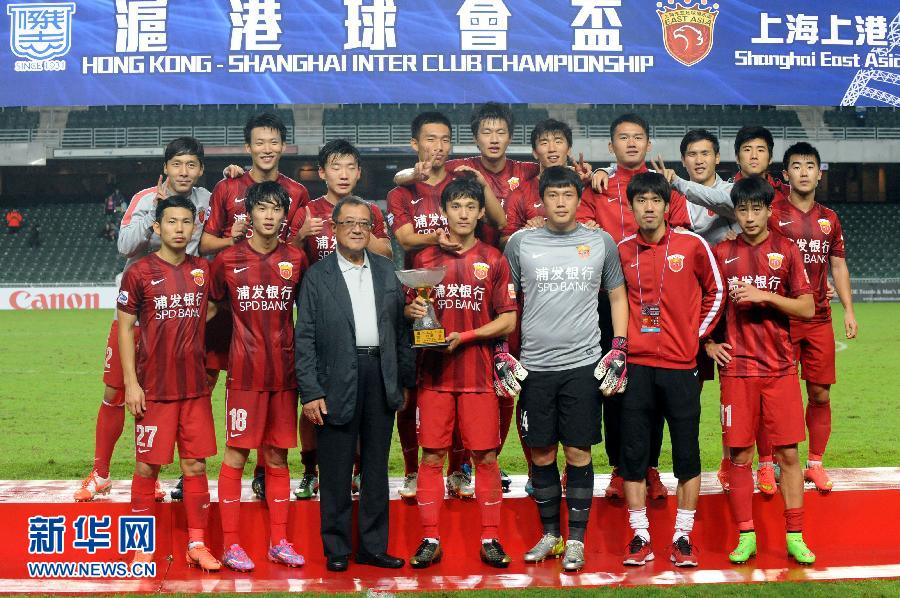 11月8日,上海上港队球员在领奖台上。当日,沪港杯足球赛第二回合比赛在香港大球场举行,上海上港队以0比0战平香港杰志队,两回合以总分6比1获得冠军。 新华社记者卢炳辉摄
