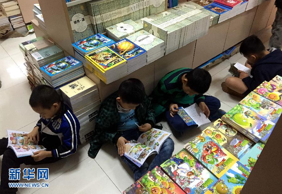 11月8日,几位小朋友在广西南宁市图书市场阅读书籍。每逢周末和节假日,广西南宁市不少小朋友在家长的带领下来到图书馆和书市,用阅读的方式充实假日生活。 新华社记者黄孝邦摄