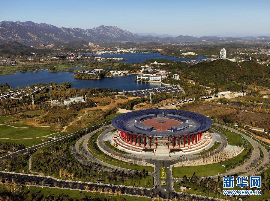 时隔13年,当中国再度成为APEC会议的东道主,世界在关注着北京。风光秀丽的雁栖湖,将见证亚太经济合作组织领导人非正式会议的务实成果。这是航拍的怀柔雁栖湖国际会展中心(10月26日摄)。 新华社发(马文晓 摄)