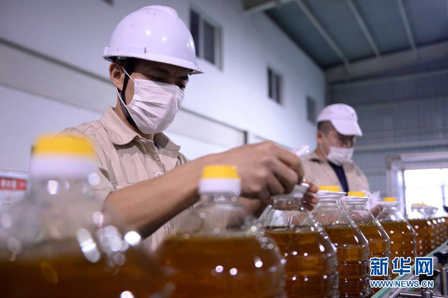 中粮粮油工业(九江)有限公司工人在生产车间分装食用油(11月6日摄)。该公司是中粮集团在中部地区重点打造的食用油加工基地,加工能力为每年40万吨,产品销往全国各地及部分海外市场。 2014年,在全面深化改革的冲锋号角中,处于长江流域承东启西关键节点的江西紧抓机遇,加强工业生产,扩大对外开放,更好分享长江经济带建设带来的红利,提升在区域发展格局中的地位。新华社记者 陈子夏摄