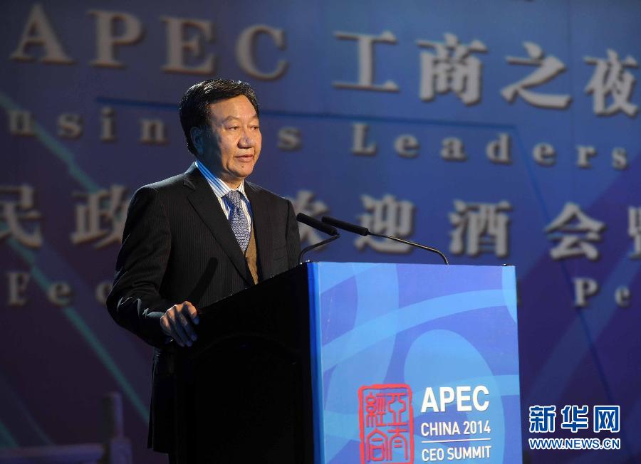 11月8日,中国贸促会会长姜增伟在活动中致辞。当日,北京市人民政府和2014年APEC工商领导人峰会组委会等共同举办“APEC工商之夜”,2014年APEC工商领导人峰会参会代表等1200余人出席。新华社记者 公磊 摄