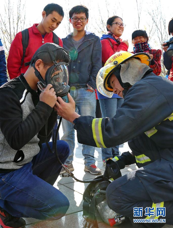 11月8日,燕山大学的一名学生在体验佩戴消防器具的感受。当日,河北省秦皇岛市公安消防支队联合燕山大学举行密集人群消防安全疏散演练,并开展消防宣传体验活动,提高广大师生的消防安全意识和防控火灾能力,迎接全国消防日的到来。新华社记者杨世尧摄