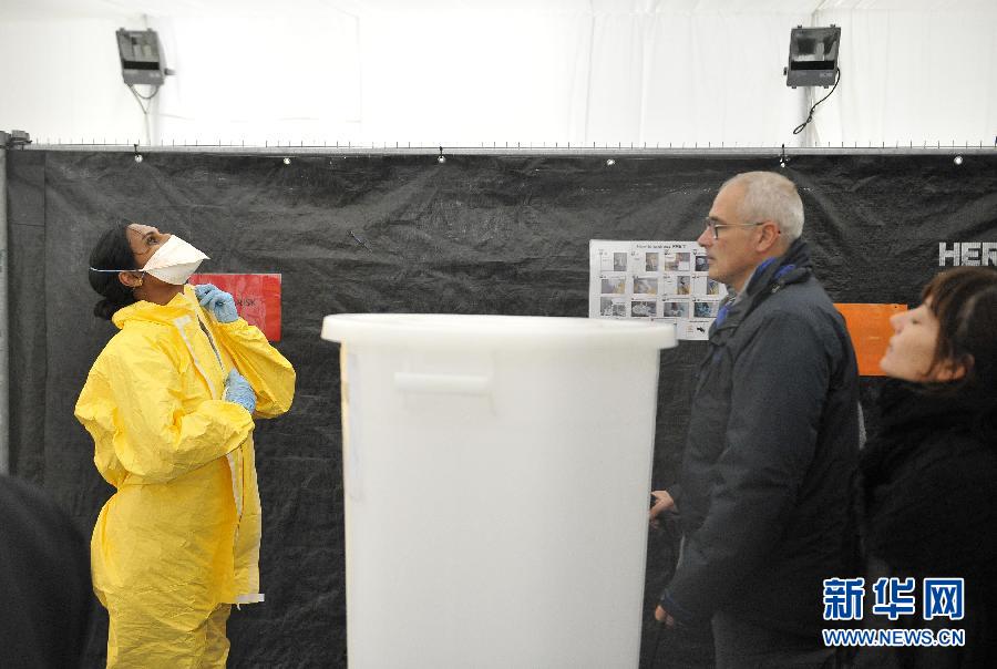 11月7日,在比利时首都布鲁塞尔一处“无国界医生”组织的培训基地,志愿者学习穿戴防护服的正确流程。当日,一些拥有行医经验但从未接触过埃博拉防治的志愿者在这里接受完全模拟西非疫区实际情况的医疗流程培训,他们将在未来数周内飞赴西非埃博拉疫区。新华社记者叶平凡摄