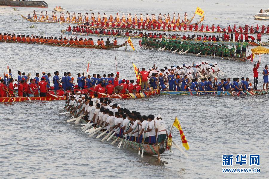 11月7日,人们在柬埔寨首都金边洞里萨河参加送水节龙舟大赛。当日,为期三天的柬埔寨重要传统节日——送水节落下帷幕。送水节最重要的活动龙舟大赛在金边王宫前的洞里萨河举行,245条龙舟和约1.7万名选手参加了为期3天的角逐。 新华社发(披隆摄)