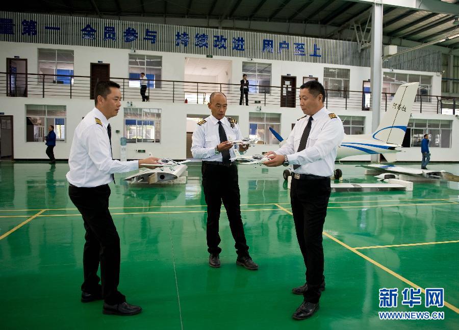 11月4日,山河飞行表演队飞行员高明、林宏、侯珉(从左至右)在株洲基地进行地面演练。11月6日,经过近800公里、4个多小时的飞行,国内第一支“全国产”飞行表演队——“山河飞行表演队”从株洲山河科技机场直飞珠海金湾机场。表演队使用4架山河阿若拉SA60L轻型运动飞机,6名在编飞行员均为中国籍,有经验丰富的原空军资深飞行员,也有刚取得民航执照的年轻飞行员。飞行队伍的年龄涵盖了“60后”“70后”“80后”和“90后”,队员们管自己就叫“6789编队”。2014年8月成立以来,经过近3个月的艰苦训练,基本达到了预期的目标,能够较好地完成三机低空编队等表演动作。飞行表演队队长侯珉说,抵达珠海后将马上开展适应性训练,在第十届中国国际航空航天博览会上献上“山河飞行表演队”的处女秀。新华社发