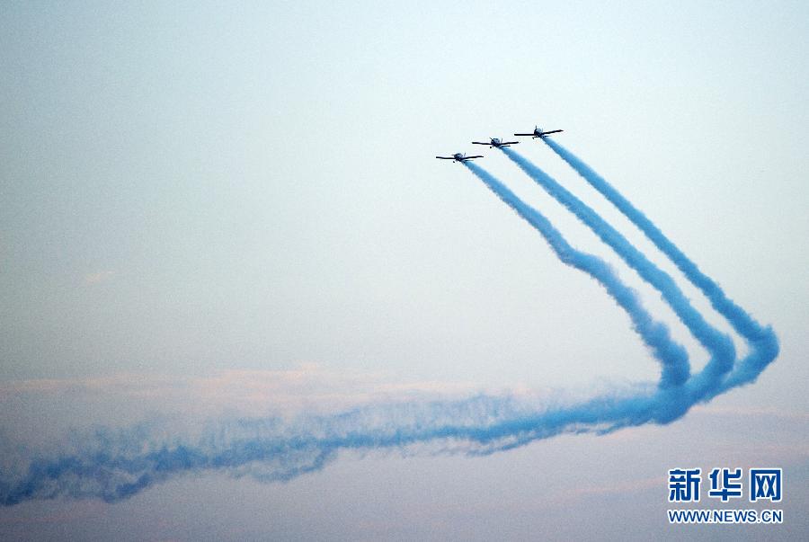 11月4日,山河飞行表演队在株洲进行3机编队飞行训练。11月6日,经过近800公里、4个多小时的飞行,国内第一支“全国产”飞行表演队——“山河飞行表演队”从株洲山河科技机场直飞珠海金湾机场。表演队使用4架山河阿若拉SA60L轻型运动飞机,6名在编飞行员均为中国籍,有经验丰富的原空军资深飞行员,也有刚取得民航执照的年轻飞行员。飞行队伍的年龄涵盖了“60后”“70后”“80后”和“90后”,队员们管自己就叫“6789编队”。2014年8月成立以来,经过近3个月的艰苦训练,基本达到了预期的目标,能够较好地完成三机低空编队等表演动作。飞行表演队队长侯珉说,抵达珠海后将马上开展适应性训练,在第十届中国国际航空航天博览会上献上“山河飞行表演队”的处女秀。新华社发