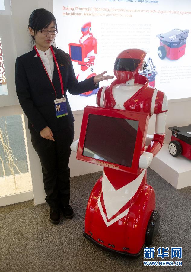 11月7日,志愿者在介绍一款用于迎宾引导的机器人。 2014年APEC领导人会议周期间,“品味北京”展在北京国家会议中心展出,展示面积共计1800平方米,包括文化传承珍品、传统老字号名品、科技创新精品三大板块。新华社记者罗晓光摄